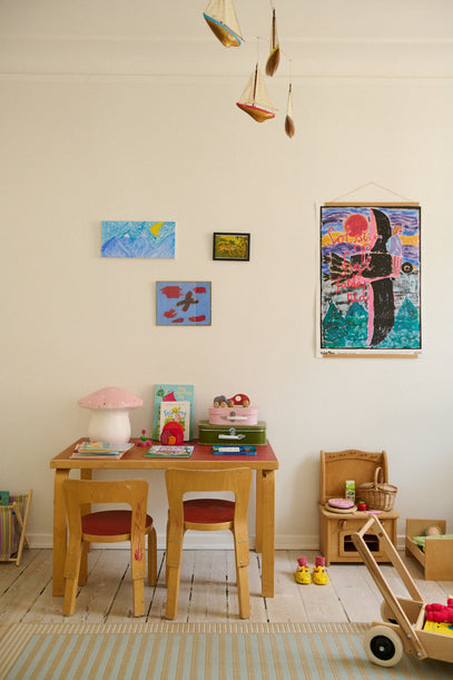 Alvar Aalto bordet og stole er fra Margots fars børneværelse og passer smukt ind på værelset. Her ses: En stor lyserød svampelampe, en stor grøn kuffert, gule sandaler, ribbede ankelstrømper i farven solbær og en lille picnic kurv ved ovnen. Kunst på væggen er blandede arvestykker og gode fund.