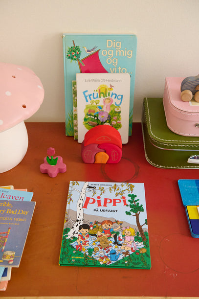 Detaljer på bordet inkluderer endnu en Astrid Lindgren-klassiker Pippi på Udflugt, en blomst lysestage inklusiv en blomst figur, farveblokke fra Stockmar og en stor lyserød svampelampe.