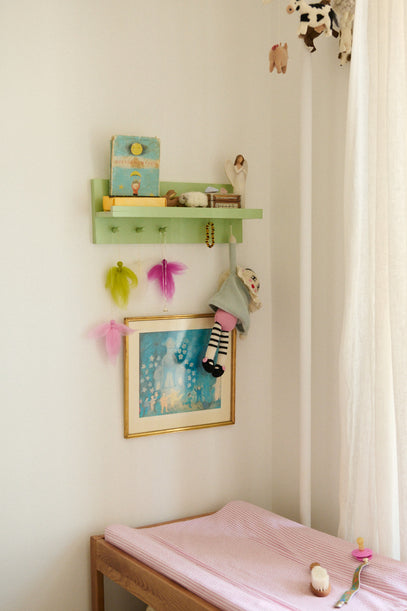 Et smukt og enkelt puslebord i træ står i hjørnet; over det hænger et fint lille billede og en pastelgrøn hylde og små feer.