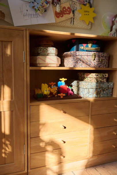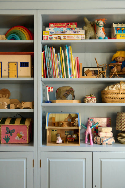 De åbne hylder øverst gør det muligt at stille de ting frem, som Norma og Elmer oftest leger med. Tilsammen giver det et fint og farverigt udtryk. På nederste hylde står en fin lille raffia kurv med sommerfugle på, og øverst står flere forskellige spil. Se vores udvalg af spil her.