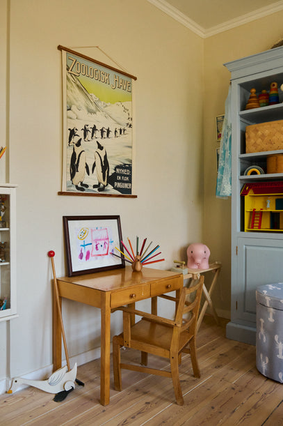 Her ses fine vintage fund såsom Kåre Klint bordet, den matchende stol og den gamle plakat fra Københavns Zoologiske Have. På gulvet står en ældre and-på-pind – se vores nye version her.