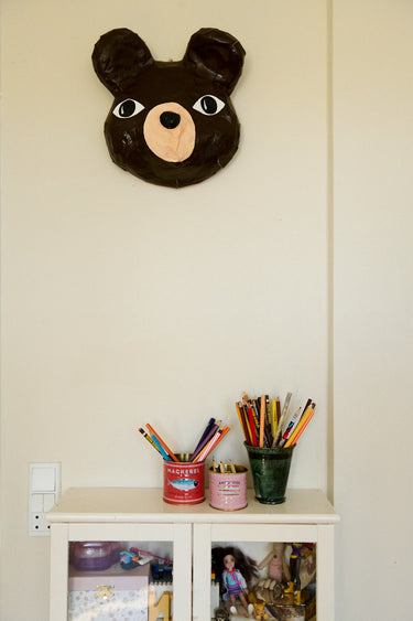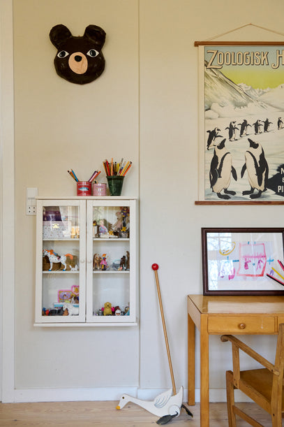 Små figurer og dyr har plads i det hvide, væghængte vitrineskab, hvor Norma bruger mange timer på at lege og organisere. Ovenpå skabet bruges to dåser til opbevaring af farveblyanter. På væggen hænger en papier-mâché bjørn.