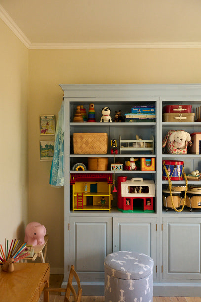 Det store skab er malet i en smuk blå farve, der hedder 'Lulworth Blue' og er fra Farrow & Ball. Den passer flot til den varme gule farve på væggene. Til venstre for skabet hænger to små Babar plakater, indrammet i sølvrammer. Se vores udvalg af Babar plakater her.