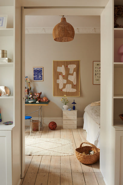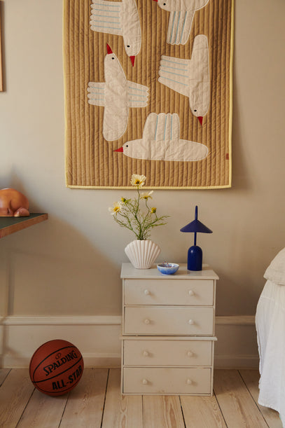 Tæppet på væggen giver et blødt look, og den blå lampe er en fin kontrast til de lyse vægge og hvide kommode.