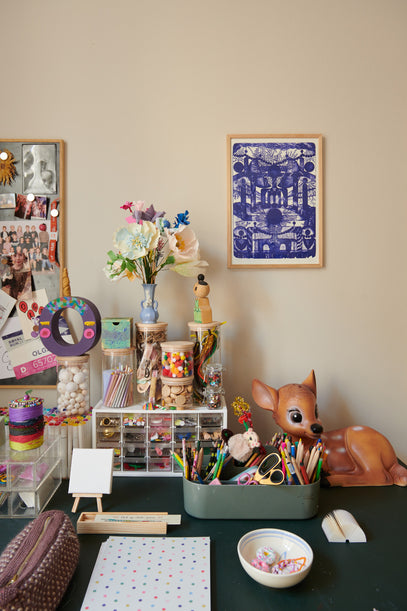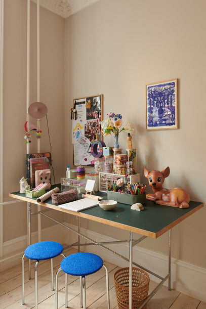 To skamler – en til Olga og en til en veninde – står fast ved Egon Eiermann skrivebordet. Det er her alle Olgas kreative ting har en plads, og også her, hun laver alt fra papirblomster til malerier til perlearmbånd og broderier.