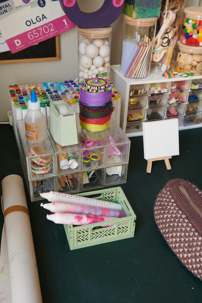 Alt fra perler til snor, sakse, farveblyanter og tuscher er fint organiseret og står enten i åbne kurve eller gennemsigtige æsker, så Olga nemt kan finde det, hun skal bruge. Små doughnuts lavet ud fra modeller-kittet ligger i den lille skål.