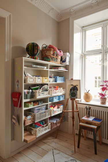 8-årige Olga har et lyst og rart værelse, som helt naturligt fordeler sig i to zoner. I den ene zone er der afslapning og hygge, og i den anden er der fyldt med alle hendes kreative ting.