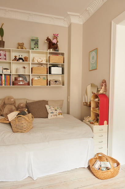 Bøger, kufferter til opbevaring, et lille rødt dukkehus og masser af puder på sengen er alt sammen med til at skabe en hyggelig stemning i hjørnet ved sengen.
