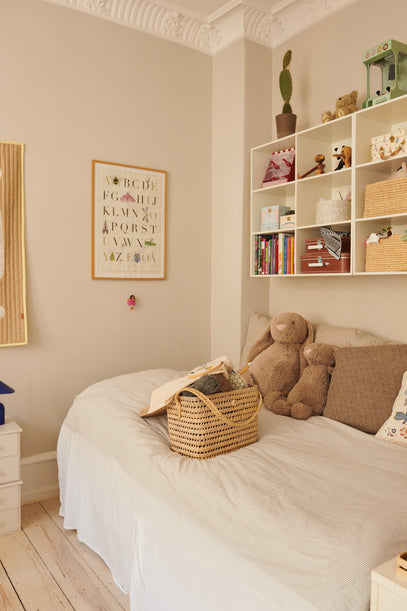 Hylder over sengen skaber en hyggelig stemning. Hylderne er fyldt med bøger, lidt legetøj, og et par kufferter til opbevaring.