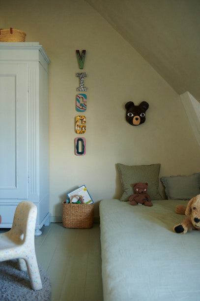 Bogstaver i papier-mâché blev købt online og sidenhen malet i forskellige mønstre og farver af Viggos mor, Fie. Ved siden af, over sengen, hænger en papier-mâché bjørn.