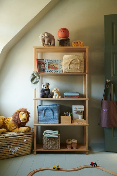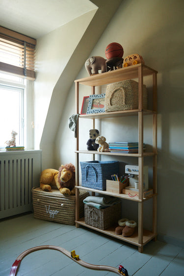 En reol i egetræ passer flot ind, og her opbevares spil, bamser, bøger, farveblyanter og meget andet. Her ses to åbne raffia kurve, en kurv i blå og en kurv i natur, plus Lulu labrador-bamsen og en bus i træ. På nederste hylde ligger et sart grønt ballon tæppe.