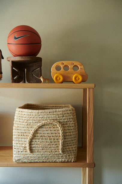 Fine detaljer på reolen med en åben raffia kurv, en lille basketbold, og en bus i træ fra Grimm's.