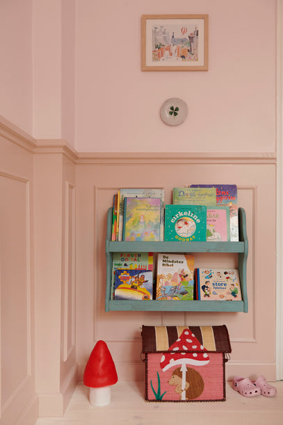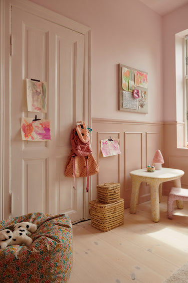 Både vægge og paneler er malet i lyserød, dog i 2 forskellige nuancer. Den ene farve er Pink Veil og den anden hedder Pink Allure. Begge farver er fra Flügger.