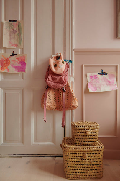 Yoko elsker at male og nogle af hendes mange tegninger er hængt på døren og de høje paneler. Søde tasker hænger også på døren, herunder et stofnet fra Bonton. Se lignende tasker her.