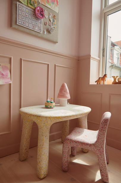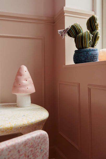Her ses en lyserød svampelampe, Luisa Bord og en Charlie Chair. I vinduet står en strikket kaktus.