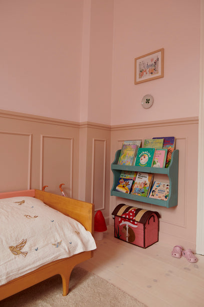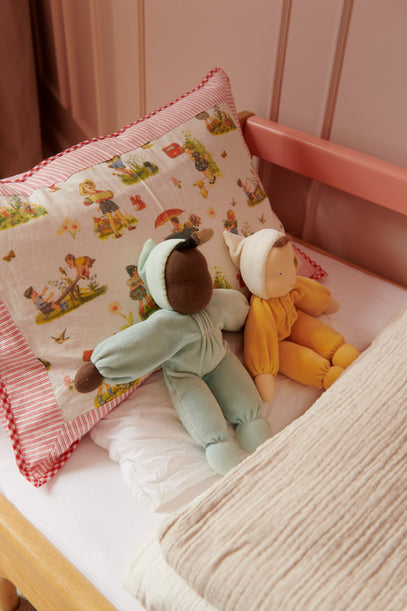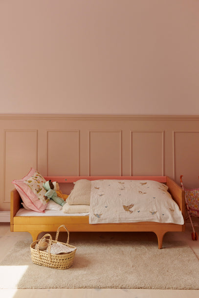 Juniorsengen er fra Kalon Studios og et smukt eksempel på enkelt design, der samtidigt har charme og personlighed. På sengen ligger to dukker, en dukke i mint og en dukke i gul.