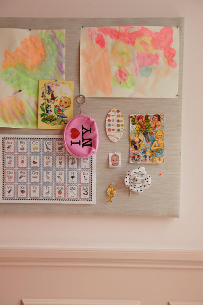 Postkort, små billeder, tegninger og andre søde ting, der skal gemmes, er hængt på opslagstavlen.
