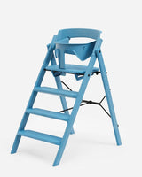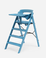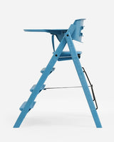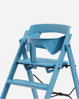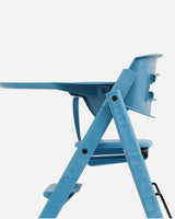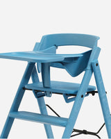 Både sikkerhedsbøjle og bakke sættes nemt fast på Klapp Højstolen ved hjælp af et smart klik-på-system. Begge dele fjernes lige så nemt igen, når der ikke er behov for dem længere.