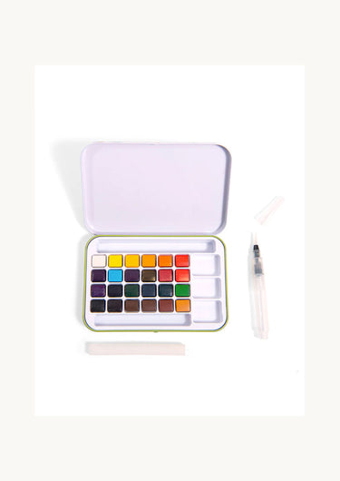 Sættet består af 24 smukke farver samt en pensel med indbygget vandbeholder og en svamp. Sættet kommer i en praktisk metalæske med låg, så farverne kan opbevares sikkert når de ikke er i brug.