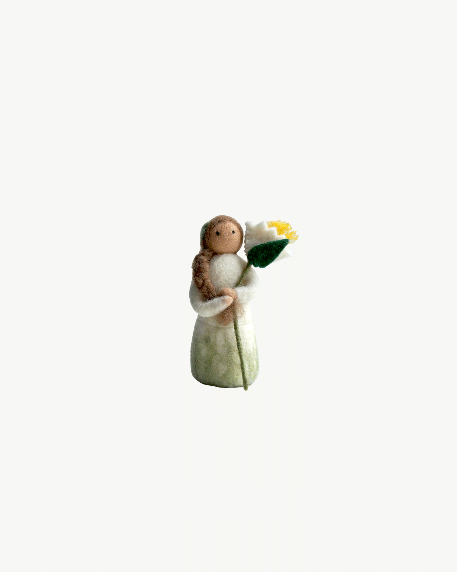 Pigen kommer med de fineste detaljer såsom en lang fletning og en blomst i håret – og så holder hun en smuk langstilket blomst i sin favn.