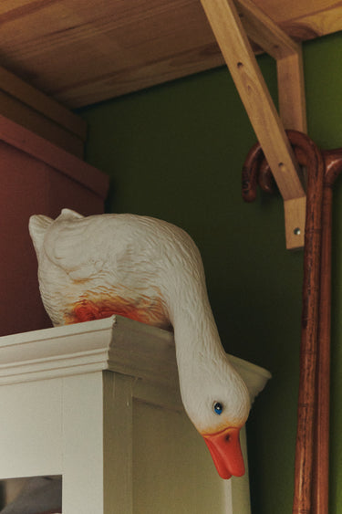 En sød og fin andelampe, der kigger ned. Andelampen giver et varmt og blødt lys.