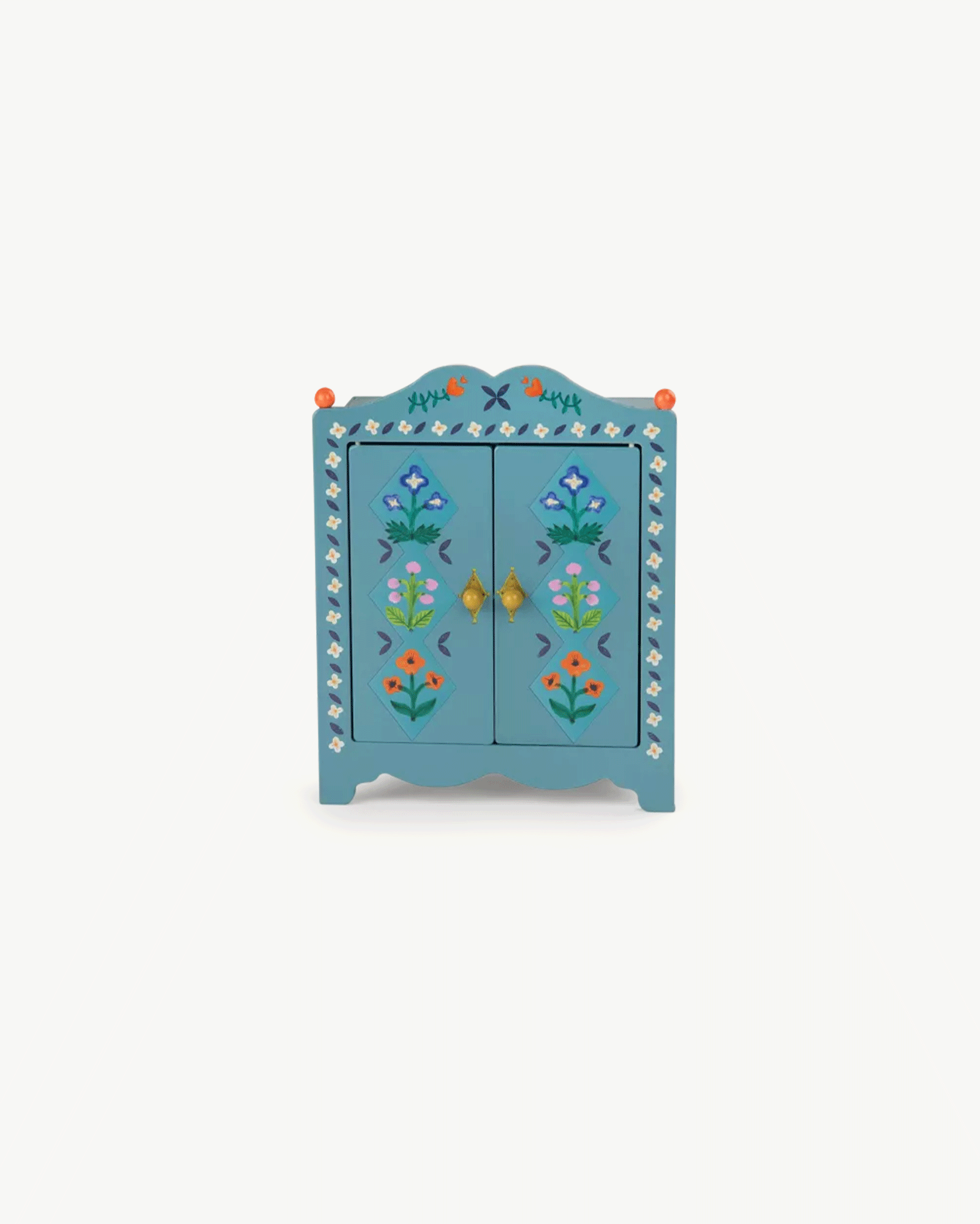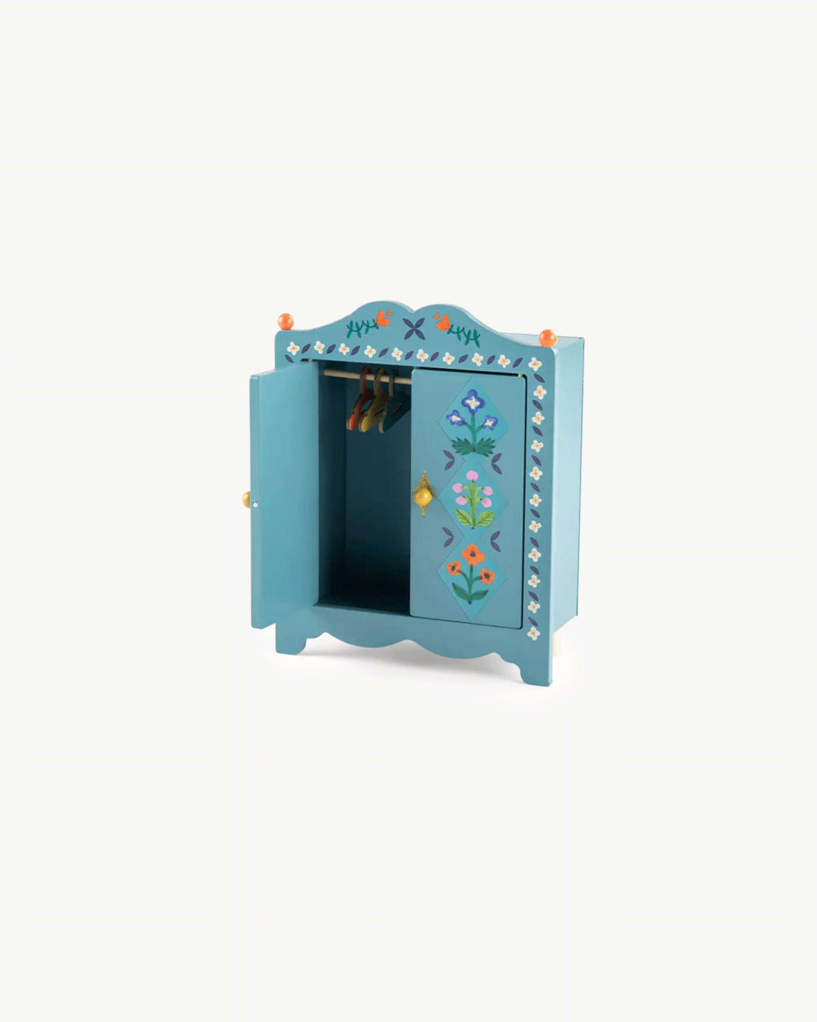 Et fint, blåt dukkeklædeskab i træ med blomster og orange knophåndtag på. Skabet har magnetisk dørlukning og kommer med 3 små bøjler.
