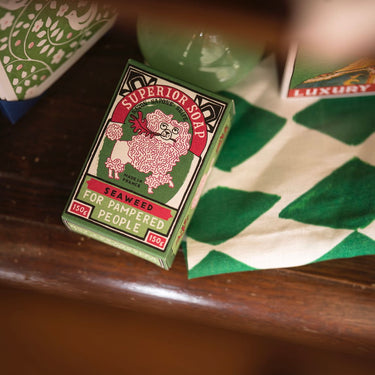 Denne sæbe kommer i en flot grøn og rød emballage med en gnaven puddelhund på. Alle sæber er veganske og fremstillet i Provence i Frankrig.