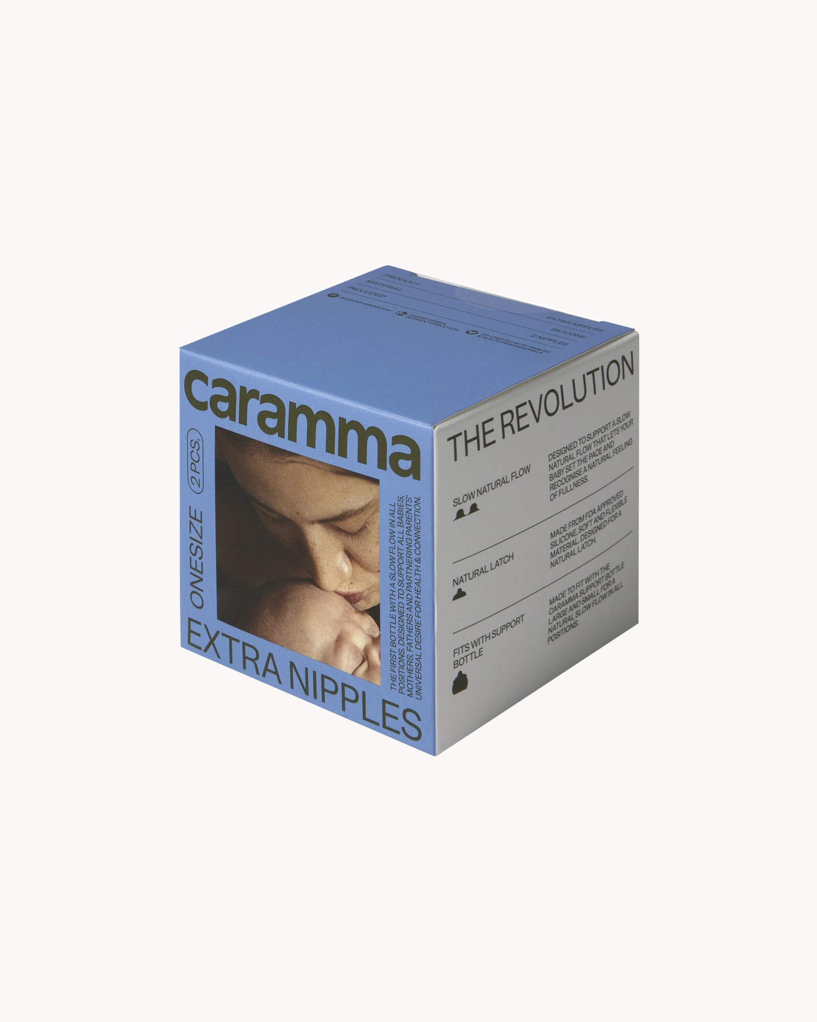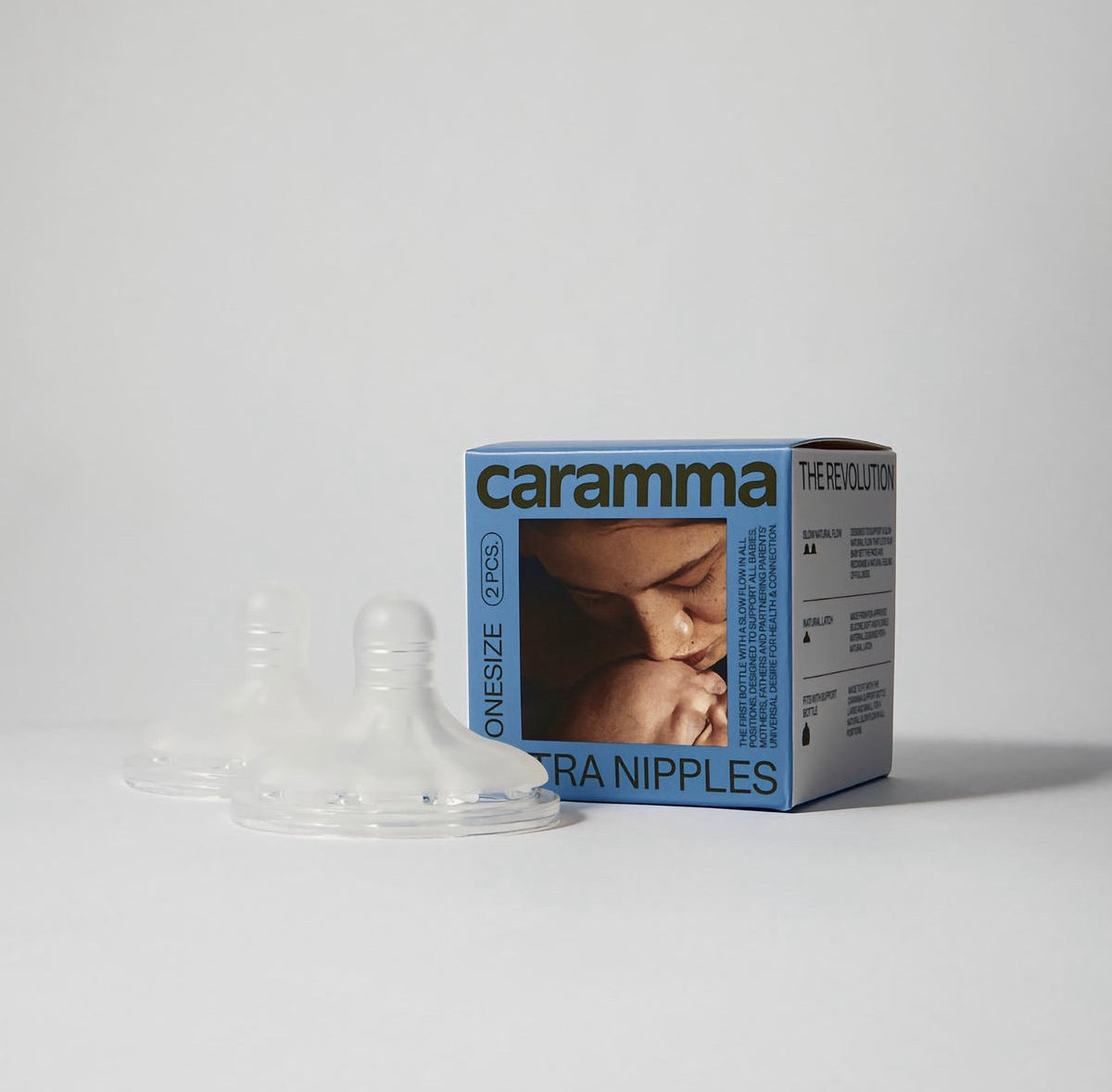 Extra nipples that fit both sizes of the Caramma support bottles (small 150 ml and large 300 ml.).